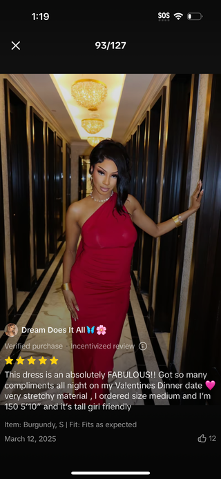 This dress is absolutely FABULOUS!! Got so many compliments on my date. The material is very stretchy and fitting.– Maria