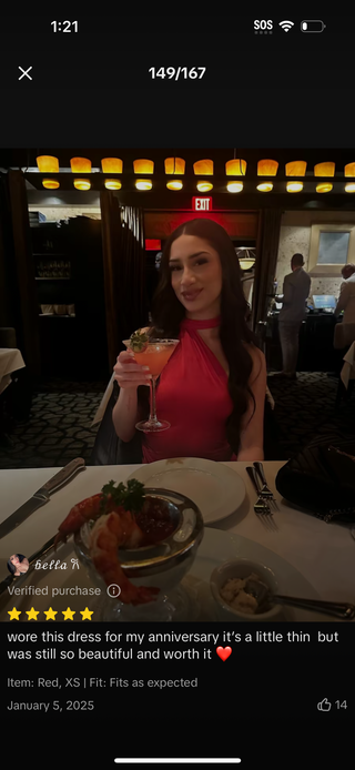 This dress is absolutely FABULOUS!! Got so many compliments on my date. The material is very stretchy and fitting.– Maria